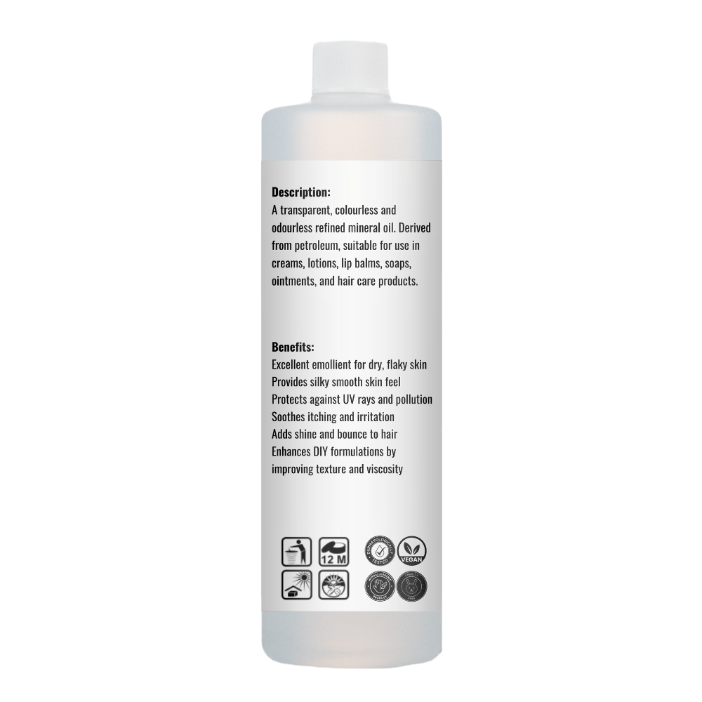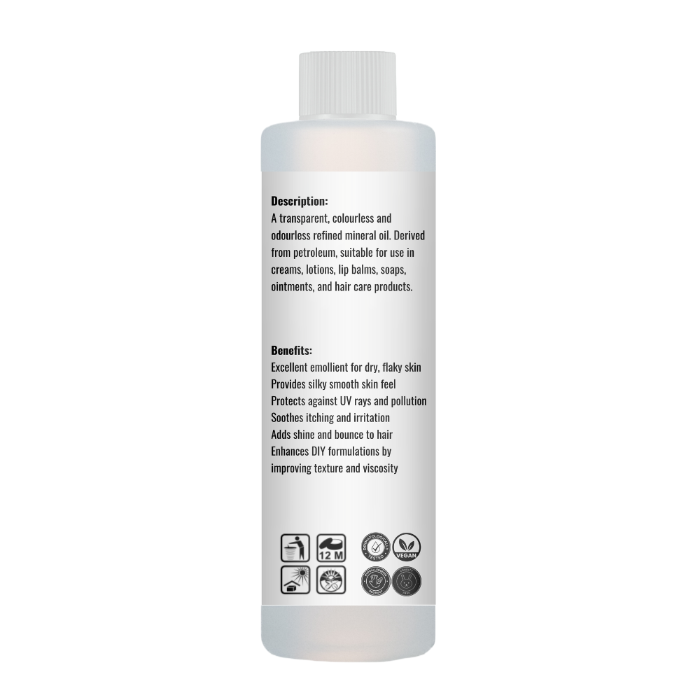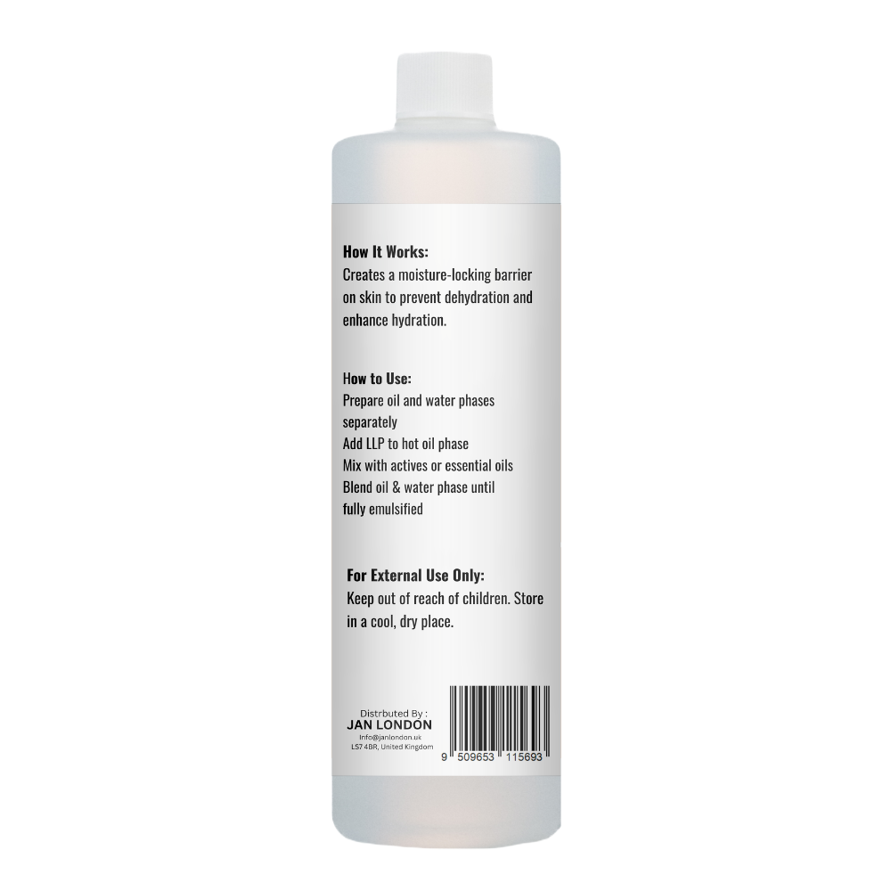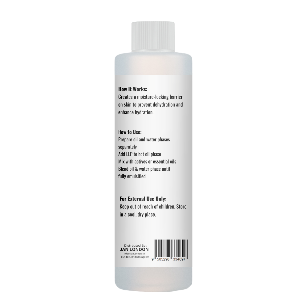 Jan London Light Liquid Paraffin (LLP) Mineral Oil is a transparent, colourless, and odourless refined mineral oil derived from petroleum. It is a versatile ingredient suitable for various cosmetic applications, including creams, lotions, lip balms, soaps, ointments, and hair care products. This cosmetic-grade mineral oil is an excellent emollient for dry and flaky skin, providing a silky smooth skin feel. It also offers benefits such as protection against UV rays and pollution, soothes itching and irritation, and adds shine and bounce to hair. Furthermore, it enhances DIY formulations by improving texture and viscosity. Available in various sizes to meet your formulation needs.