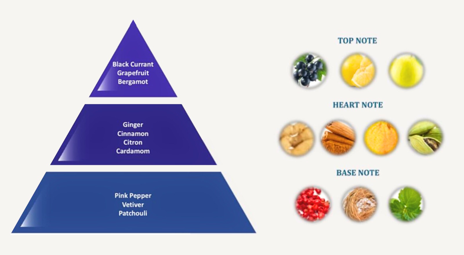 Top Notes: The fragrance opens with a burst of freshness. The bright zest of grapefruit and bergamot mingles with the sweet tartness of black currant, creating an invigorating start to your day.